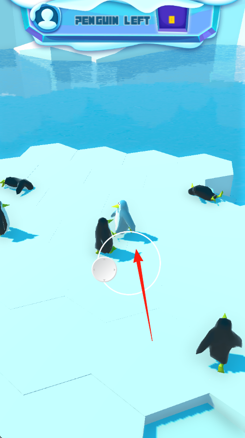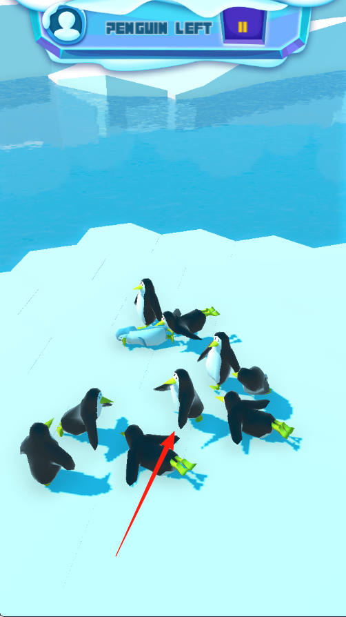 1、进入游戏后,点击选中浅色企鹅,在冰面场景,与其他企鹅接触、互动,触发群体反应。