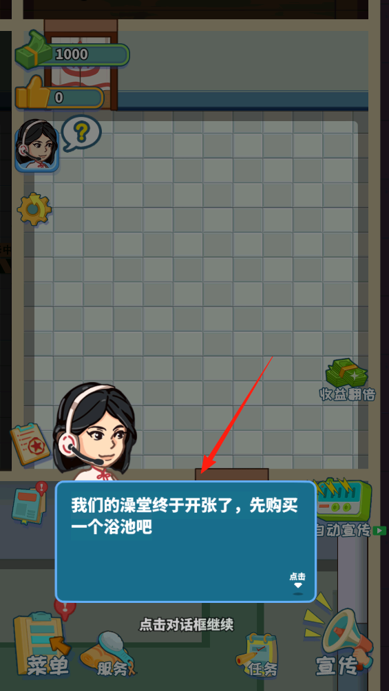 1、先点蓝色对话框花500金币买个基础浴池,这样就能接待第一批客人赚钱了,那个收益翻倍可以暂时提高收入,不过要等攒够金币才能经常使用,记得留着关键时刻开哦。