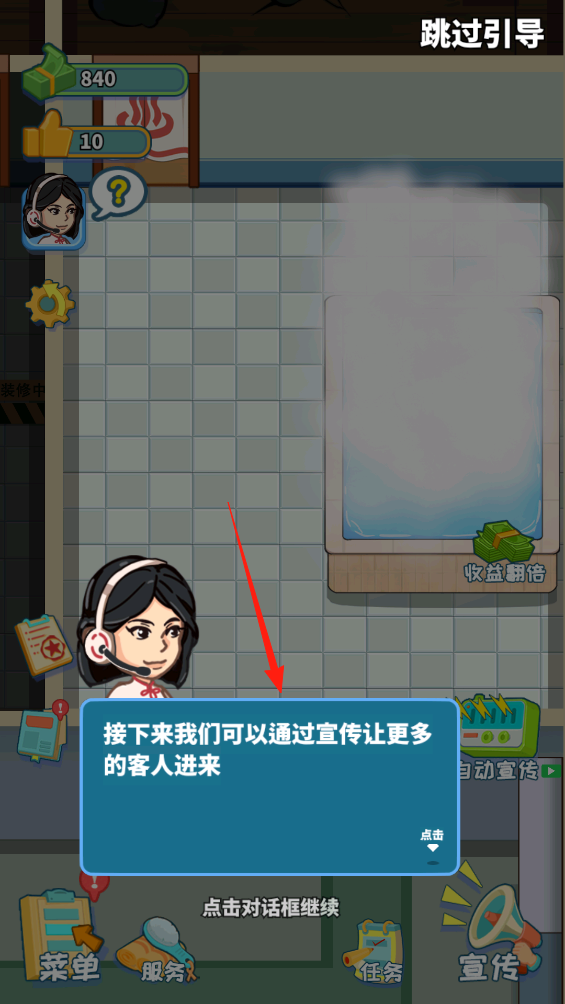 3、现在要点宣传按钮发传单吸引新客人,每次宣传要花50金币但能带来3波顾客,左上角点赞数到10会触发特殊事件,可能遇到愿意付双倍房费的VIP客人呢。