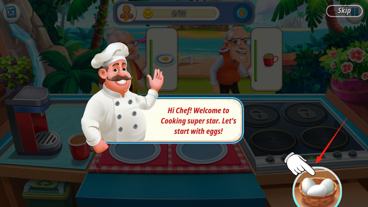 1、厨师会手把手教你从拿鸡蛋开始,点击右下角的鸡蛋篮就能开始基础烹饪,注意看左上角的进度条,每完成一个基础操作都会积累经验值,解锁更多炉灶功能。