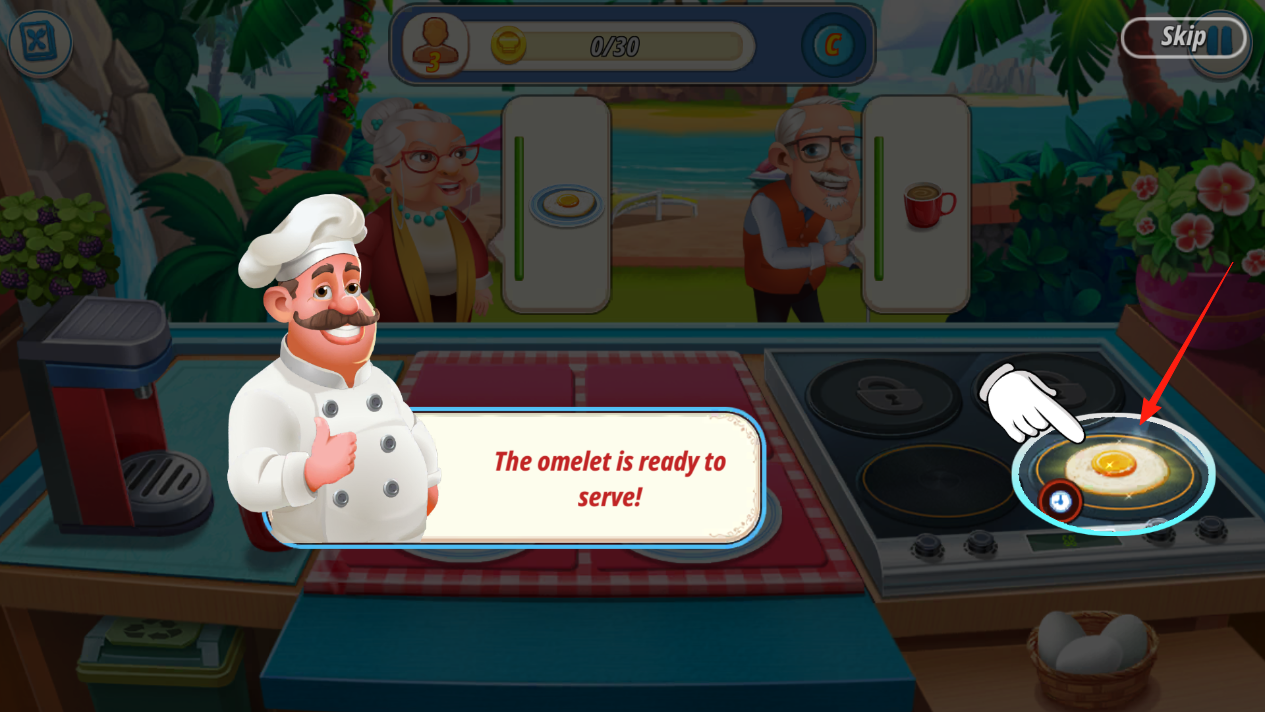 2、按照订单板上的煎蛋图案来操作,煎到金黄冒泡时就能点击上菜啦,厨师会给你实时反馈,做得好他还会竖起大拇指夸你呢,背景里的老顾客都在等着尝你的手艺。