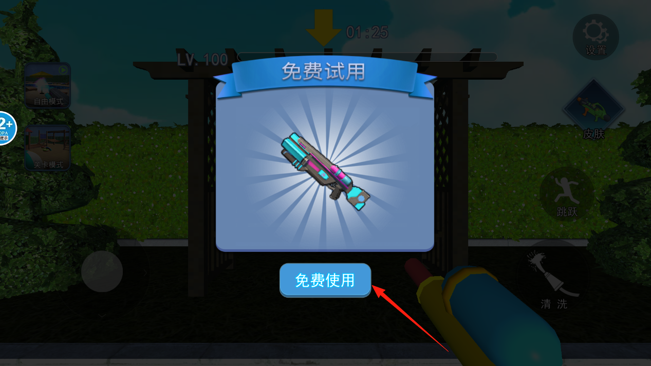 2、这把蓝粉清洗枪试用时会喷出彩虹色水柱,特别适合处理顽固污渍,试用时间里可以随便玩,用完记得去皮肤看看能不能永久获得它。