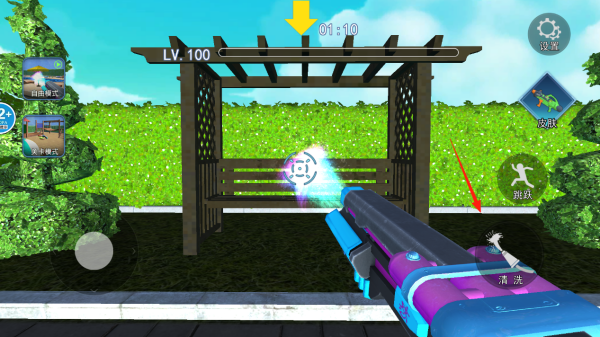 3、对着LV.100的木质凉亭冲洗时,注意看水流冲击的位置会有实时清洁效果反馈,用跳跃按钮调整角度可以洗到高处角落,完美清洗后凉亭会变得闪闪发亮哦。