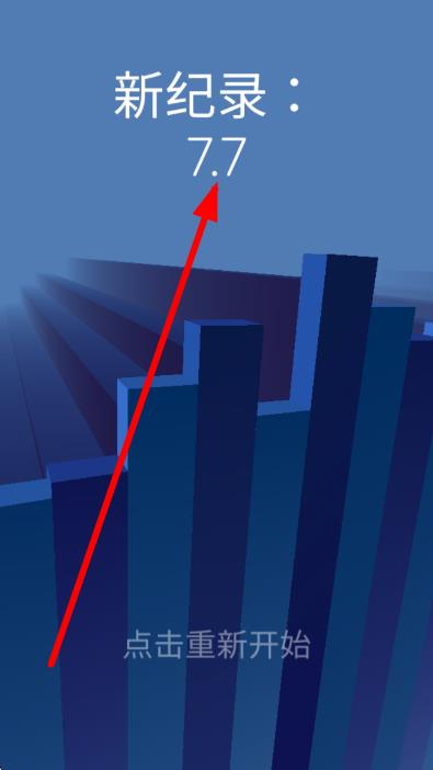 3、游戏结束后,查看“新纪录:7.7”,点击重新开始,优化挥动、飞行时机,挑战更高纪录,突破障碍距离。