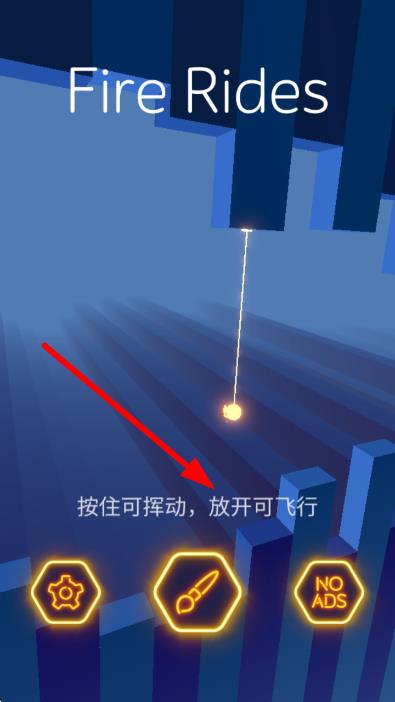 1、进入Fire Rides游戏,按住可挥动,放开可飞行的提示,长按屏幕挥动光球,蓄力后放开让其飞行,穿越障碍。