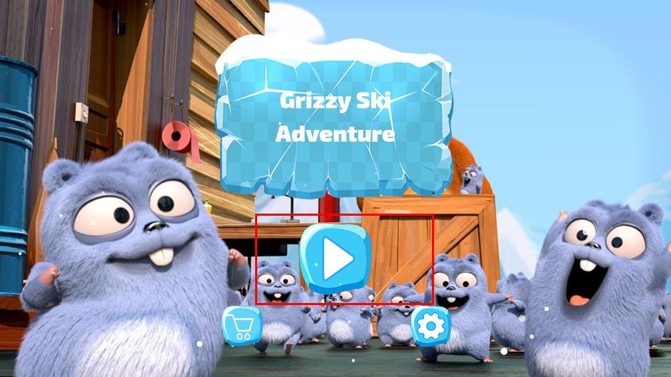1、冰雪纹理的蓝色标题牌Grizzy Ski Adventure悬浮于画面中央,下方嵌着圆润的蓝色播放按钮,即可操控滑雪角色。