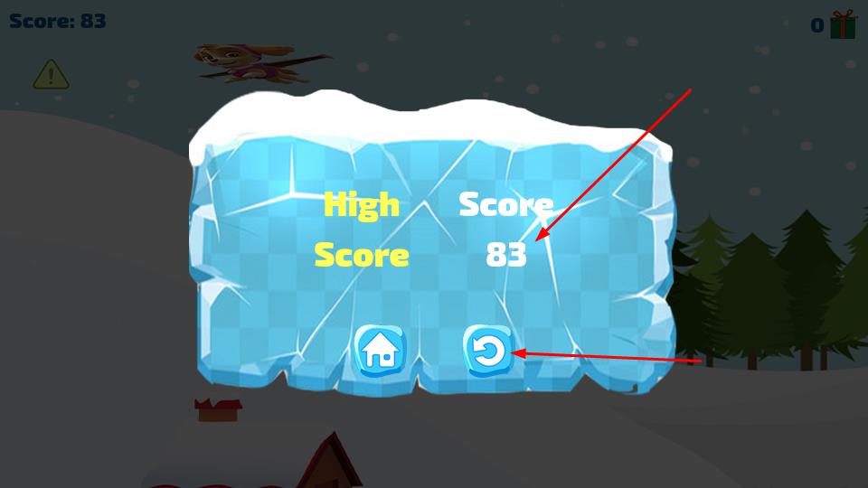 3、当角色停止滑行,界面弹出覆雪的冰块状结算面板,亮黄色High Score字样旁,清晰显示本次挑战的最终分数。