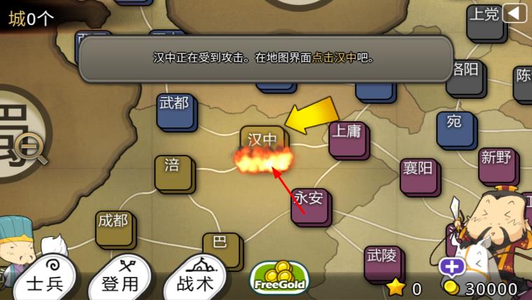 1、进入游戏,当收到城池受攻击提示,如汉中正在受到攻击,在地图界面点击受攻击的城池。