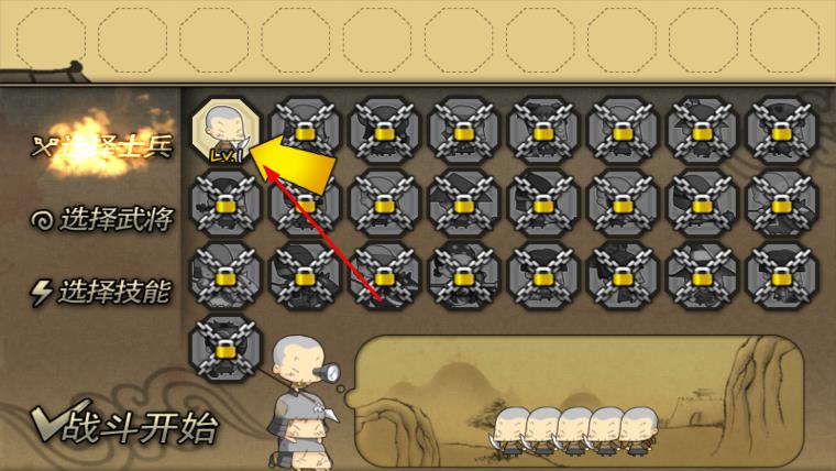 2、进入战斗准备界面,依次选择士兵、武将、技能,合理搭配战斗阵容,完成准备后点击战斗开始。