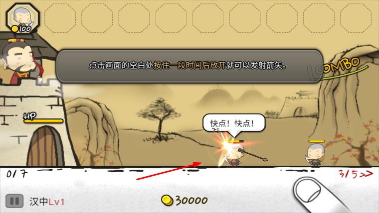 3、在战斗界面,点击画面空白处并按住一段时间后放开,发射箭矢攻击敌人,成功抵御敌人进攻,守护城池。