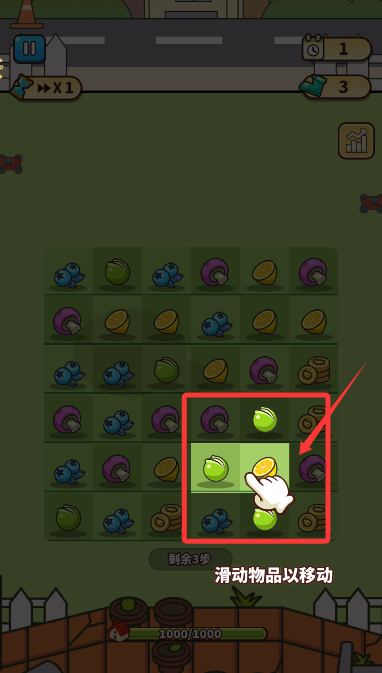 2、滑动屏幕将相同蔬果排列成行,触发连锁消除获得战斗能量。