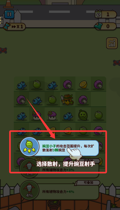 4、每次消除后,可选择"射程强化"等增益效果,提升豌豆射手作战能力。