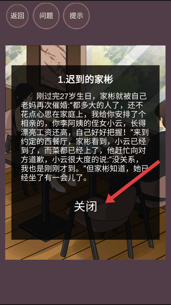 1、阅读迟到的家彬相亲剧情以及本次关卡的任务后,点击关闭按钮,退出当前故事展示界面。