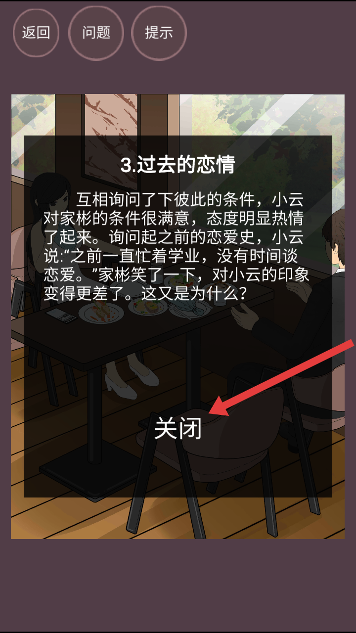 3、阅读过去的恋情对话剧情和问题后,点击关闭,在本次相亲吃饭的场景中寻找解决问题的答案。