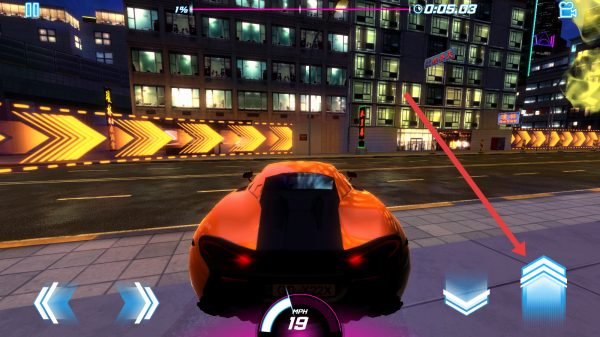 1、点击右侧加速按键,驱动橙色赛车在霓虹城市街道启动,开启竞速赛程,借加速抢占开局优势。