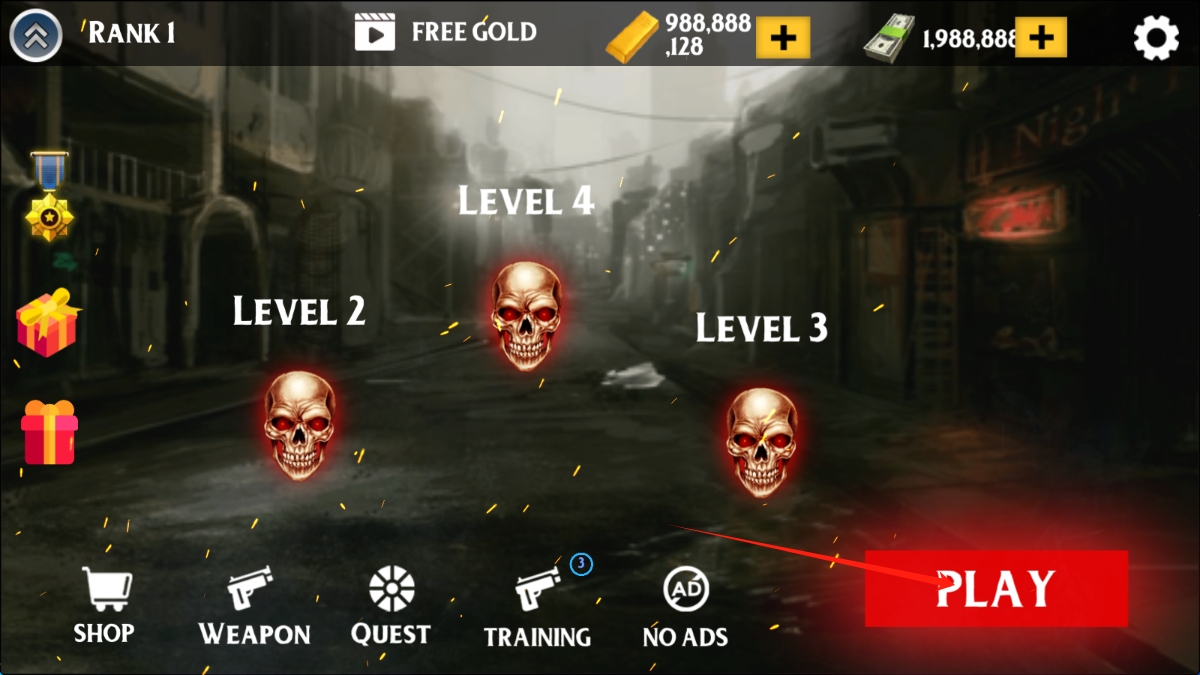 1、在僵尸射击动作游戏主界面,选择合适的关卡,点击进入游戏,若需装备或道具,可先进入商店或武器界面进行准备。