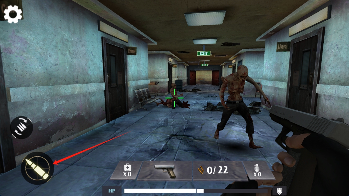 2、进入游戏场景,在昏暗的走廊中,集中注意力,瞄准僵尸进行射击,注意躲避僵尸攻击,合理利用弹药,关注生命值和弹药数量。
