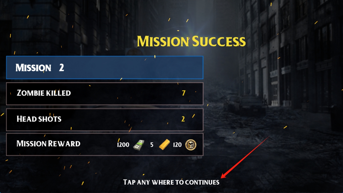 3、完成任务后,在任务完成界面查看任务成果和奖励,点击Tap-Any-Where-to-Continues,继续挑战更高难度的关卡,提升游戏成绩。