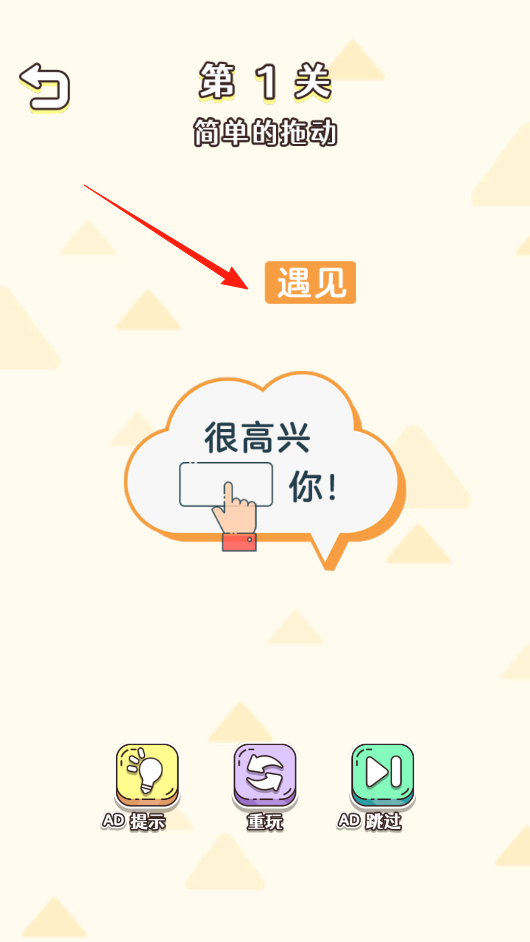 1、对话框里的空白处需要你拖动文字块来补全句子,完成这个互动就能进入下一环节,底部黄紫绿三个按钮分别对应提示,重玩和跳过功能,新手建议先试试提示按钮。