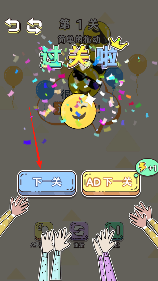 2、看到过关啦的彩色字样就说明你成功通过了,戴墨镜的卡通头像会为你庆祝,想继续挑战就点蓝色下一关按钮,黄色AD按钮能额外获得奖励但需要观看广告。