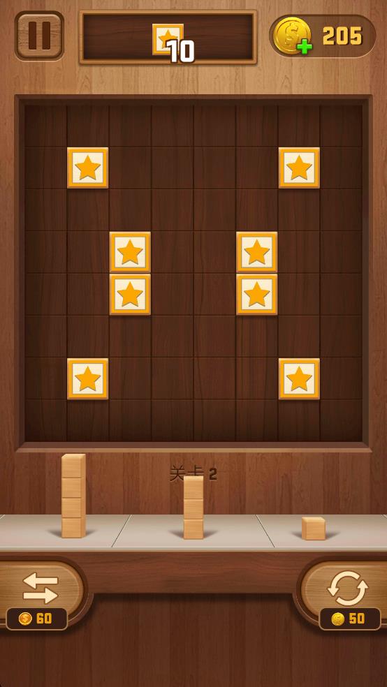 2、依据指引,将带星星的木块拖至对应行空白位置,通过填满一行来消除并收集星星,优先选择缺块少的行填充。