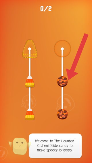 1、第一关拖动对应移动糖果如玉米糖、彩球糖到上方的模具虚线的形状上,填满了完成1个棒棒糖。