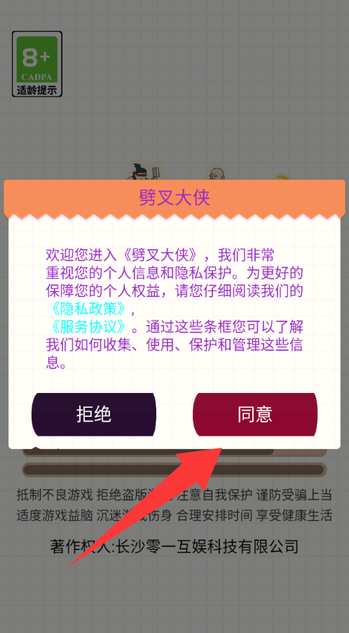 1、点击劈叉大侠里面的同意并进入。