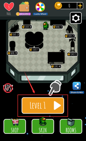 4、点击红框LEVEL1按钮,开始第一关游戏挑战。