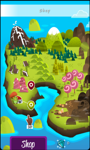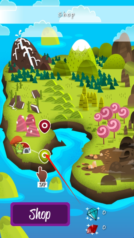 2、进入游戏地图界面,点击绿色目标点,开始冒险,若需道具或升级,可点击Shop进入商店。
