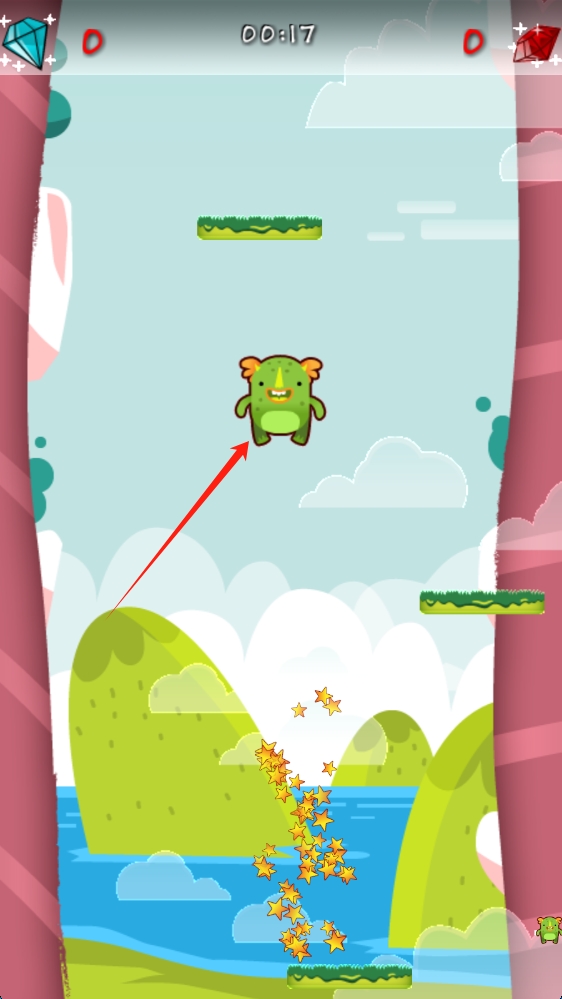 3、在游戏场景,操控绿色怪物灵活跳跃,收集星星,注意时间限制,争取获得更高分数,顺利完成冒险任务。