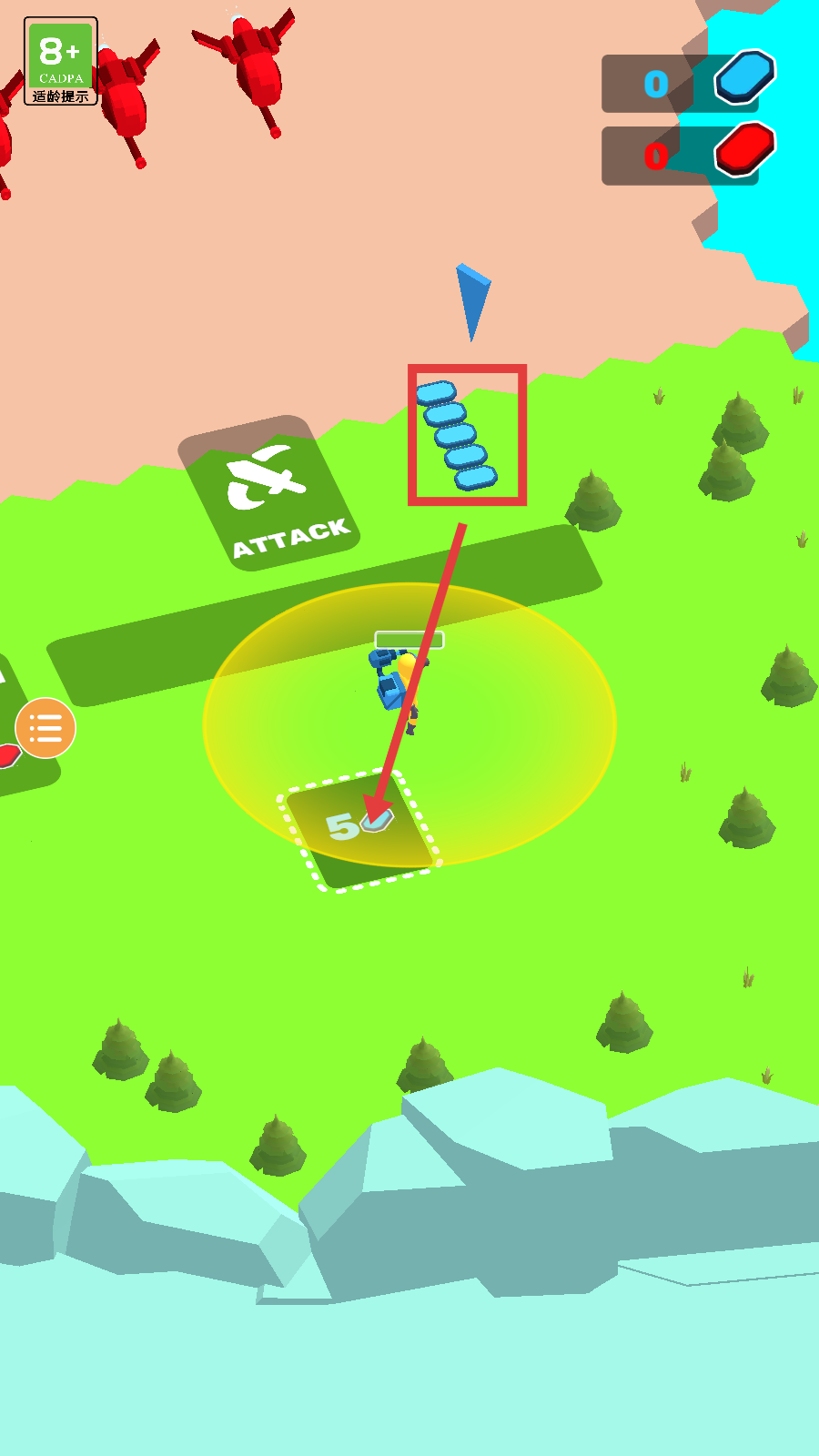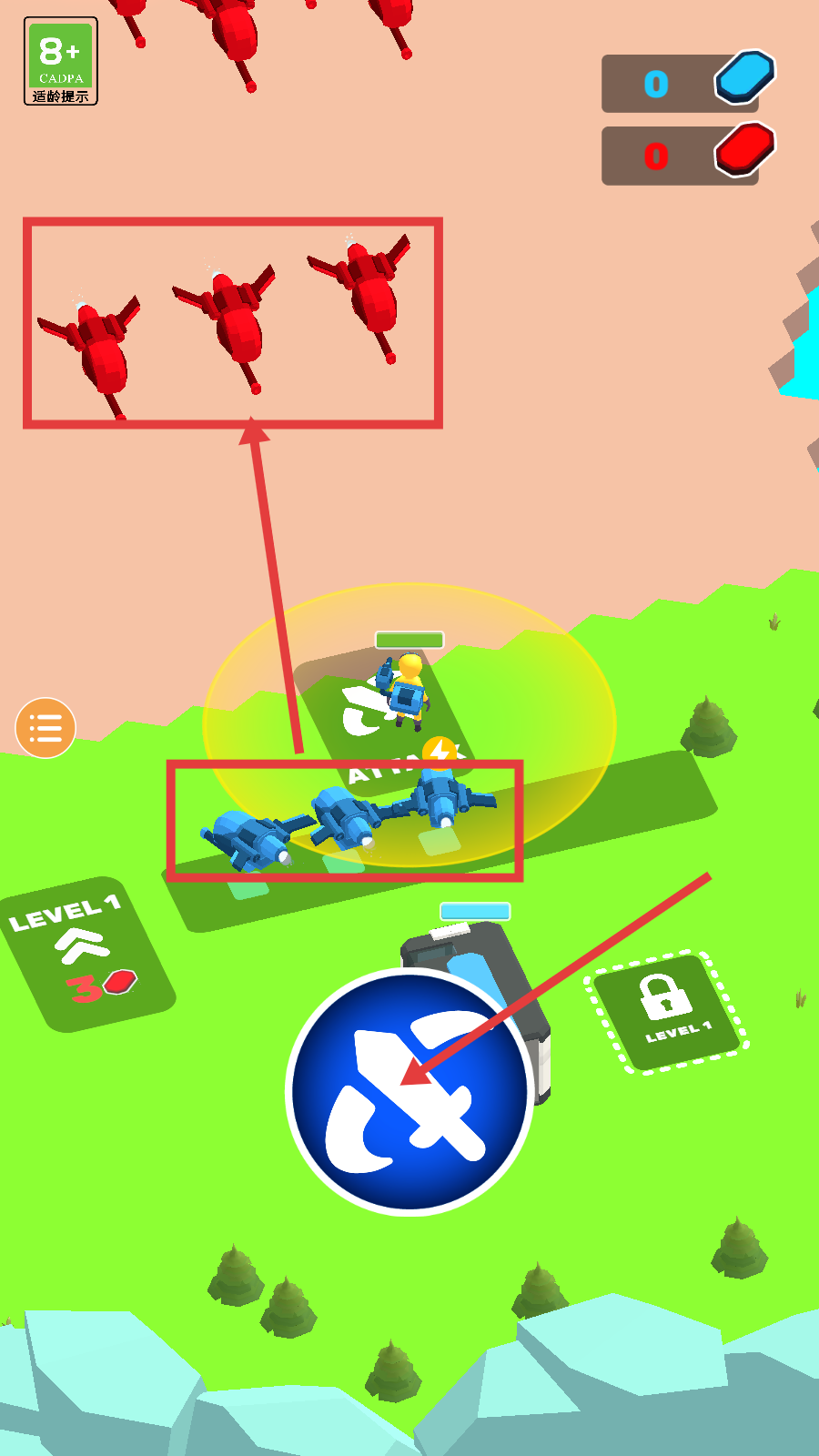 3、收集【红色资源】满足LEVEL1升级条件,通过箭头区域获取资源提升炮台战力,推进关卡进程。