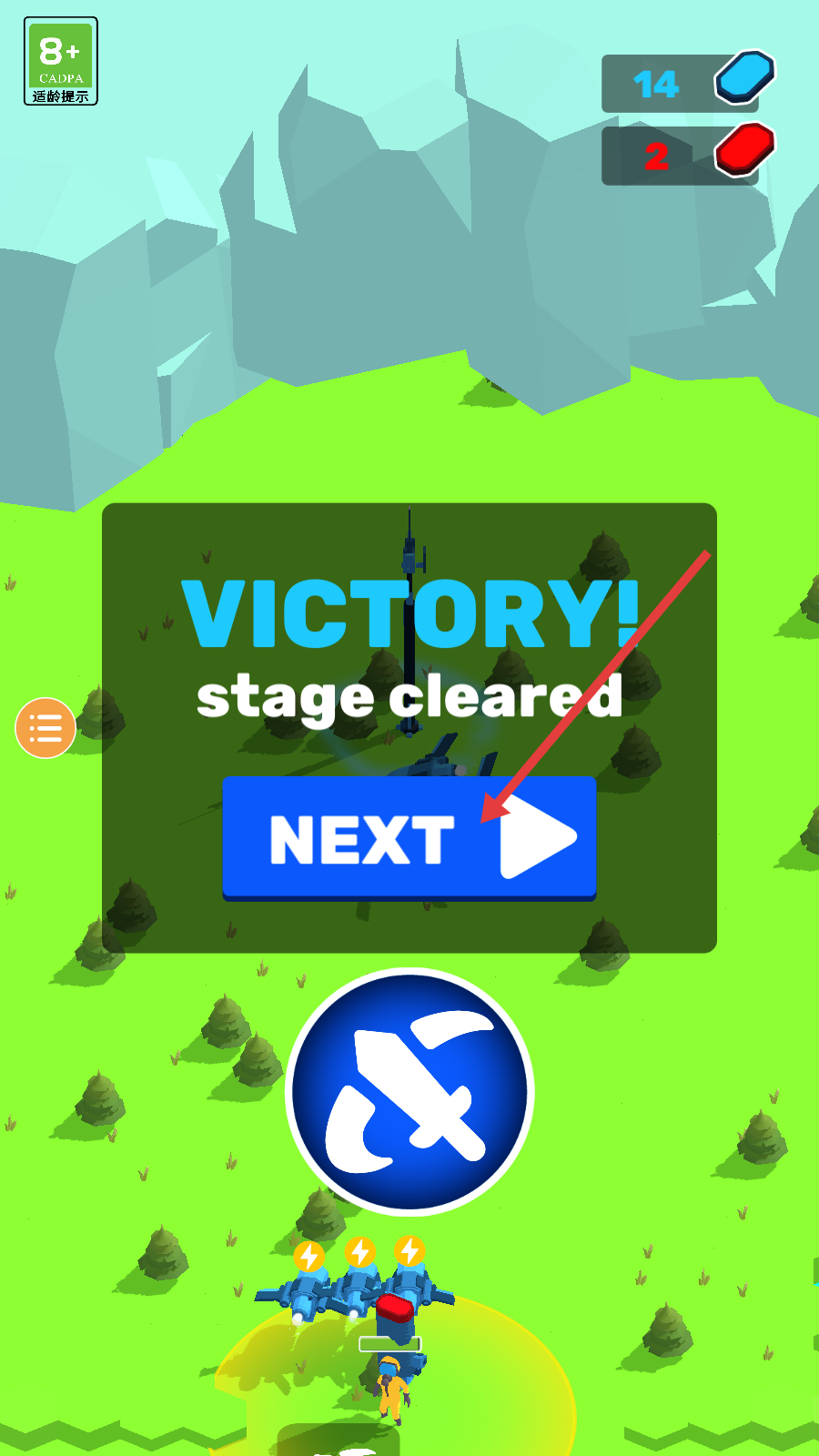 4、通关后点击【NEXT】按钮进入新关卡,积累资源与经验,强化防御设施应对更复杂敌机挑战。