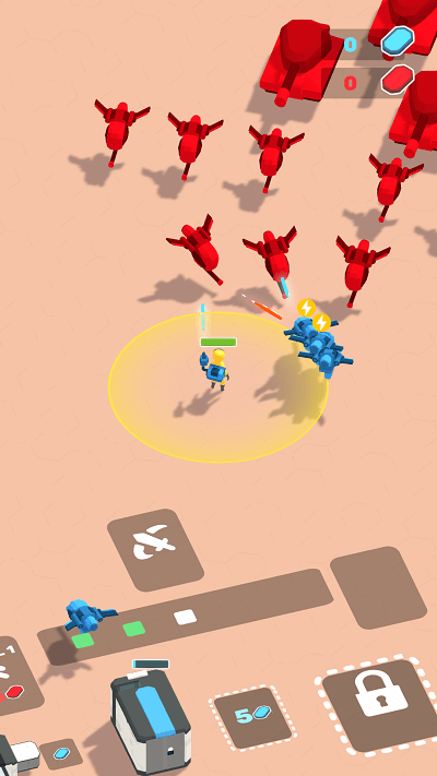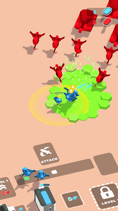 2、遭遇【红色敌机】时,依托蓝色炮台并点击攻击按钮反击,借助防御设施抵御攻势,保障资源收集安全。