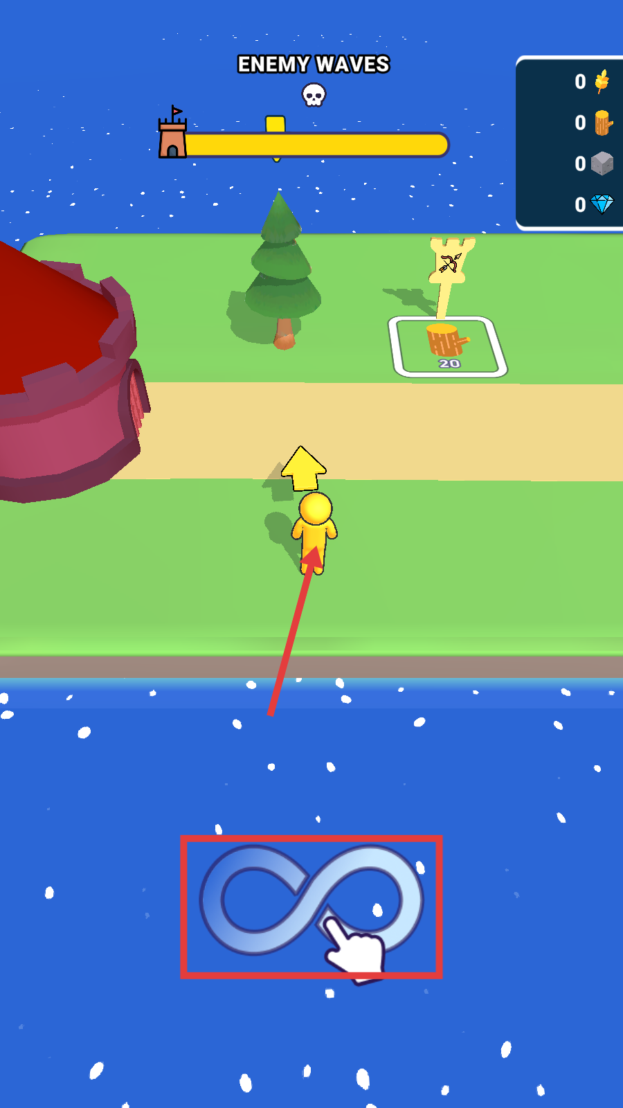 1、开局点击下方无限符号图标,获取资源或增益效果,操控黄色小人向指定方向移动,准备应对敌人波次。