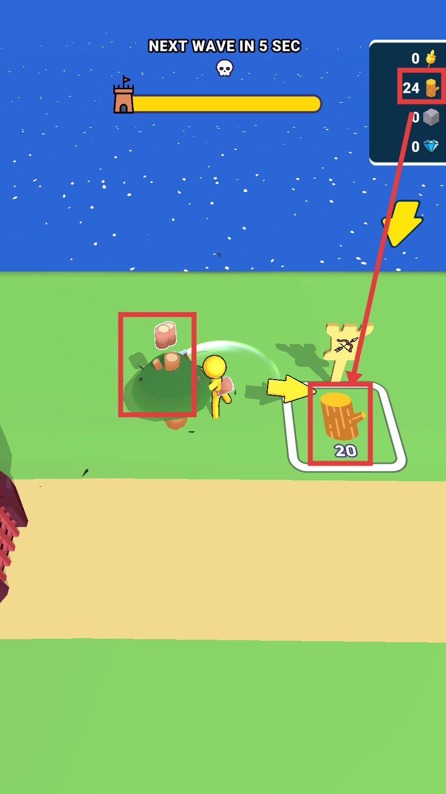 2、砍伐树木收集木材,将木材放入指定区域(如标注"20"的位置),积累木材资源(右上角实时显示木材数量)。