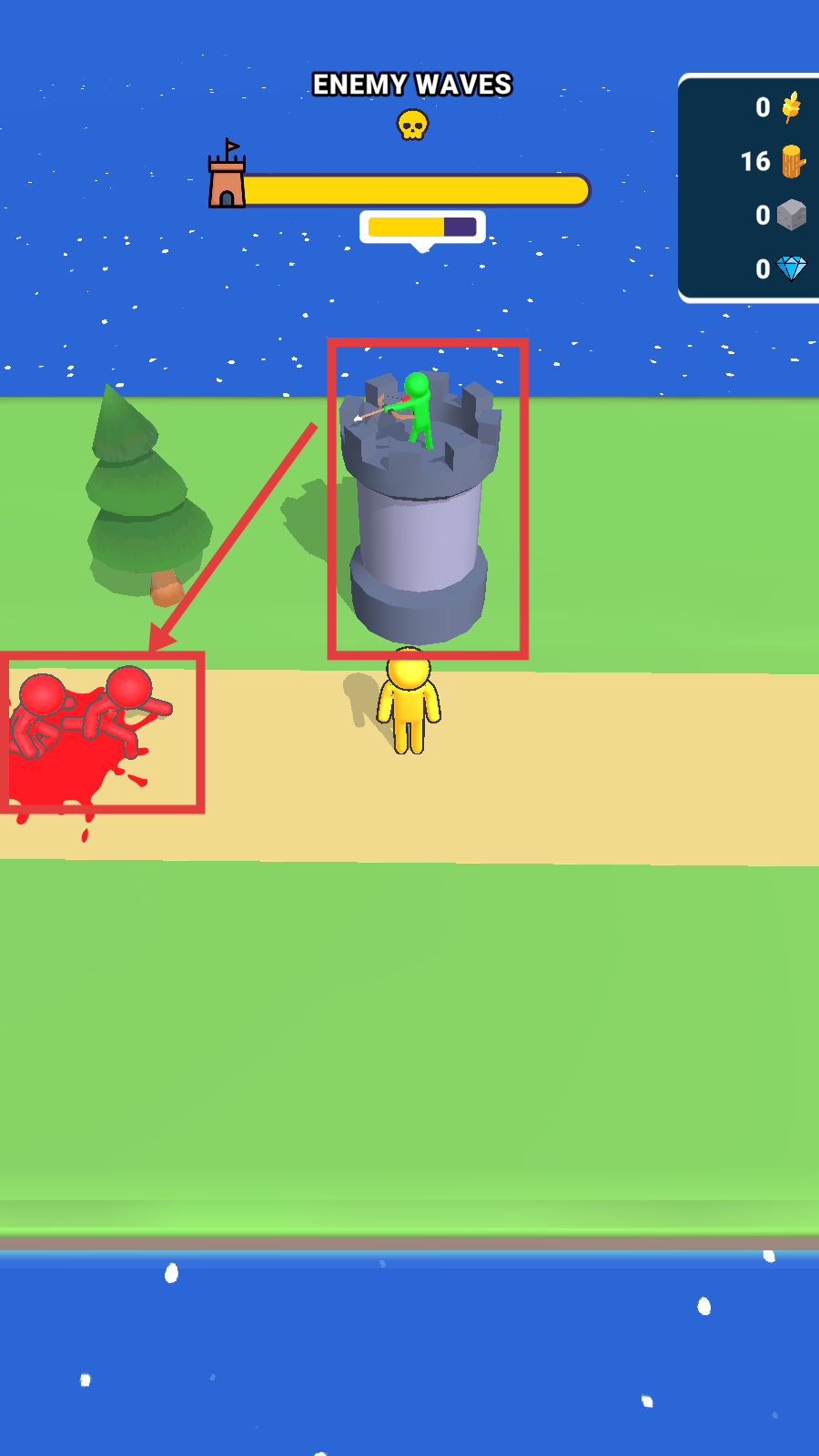 3、消耗资源建造箭塔,箭塔会自动攻击红色敌人,依托箭塔抵御多波敌人进攻(关注上方"ENEMYWAVES"进度条)。