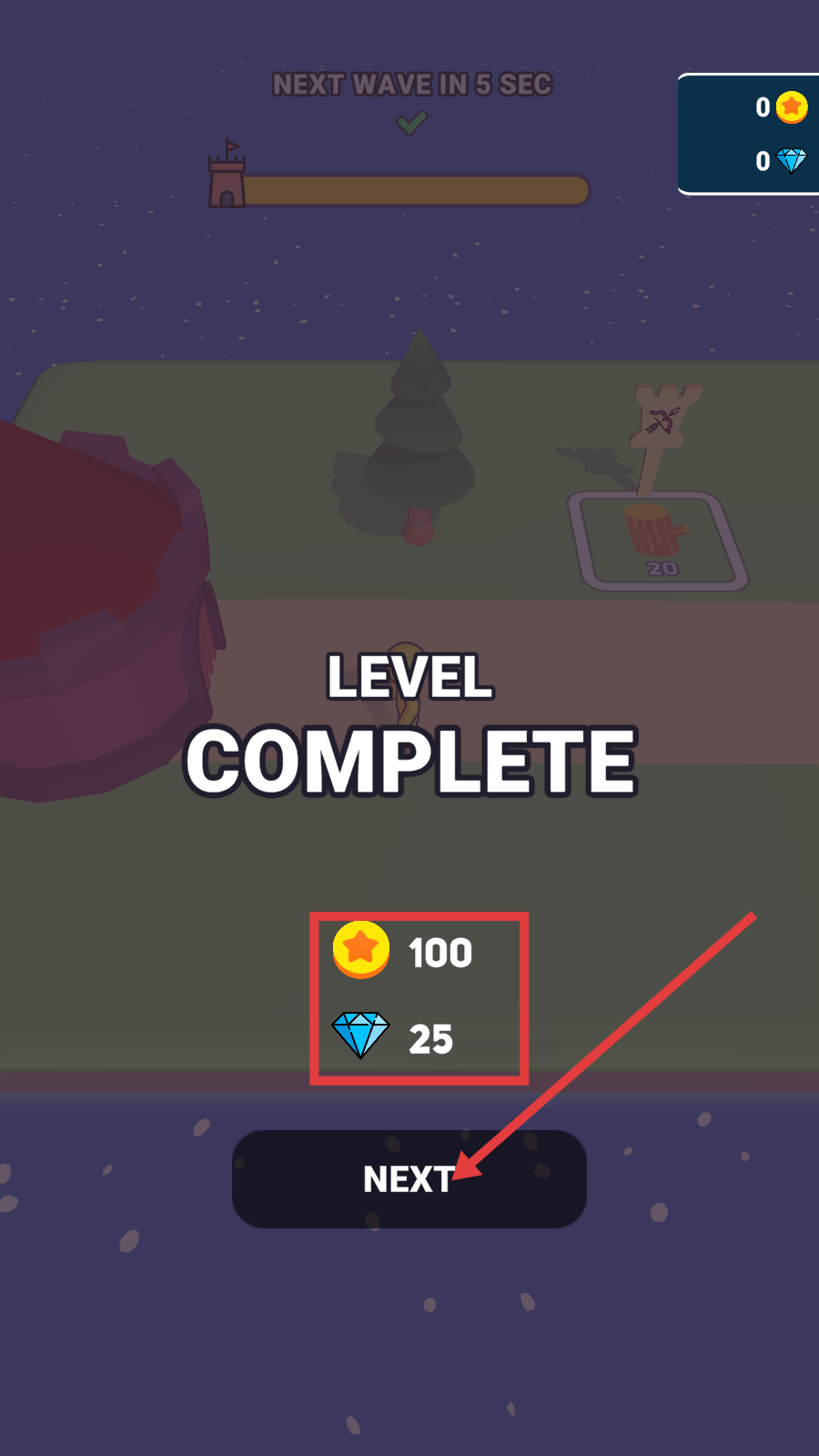 4、成功击败所有敌人波次后,关卡完成可获得100金币与25钻石奖励,点击【NEXT】按钮进入下一关,循环积累资源升级建筑。