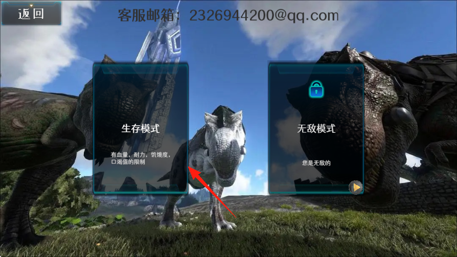 1、于初始界面,选定生存模式受血量、耐力、饥饿度、口渴值限制,开启恐龙世界冒险。
