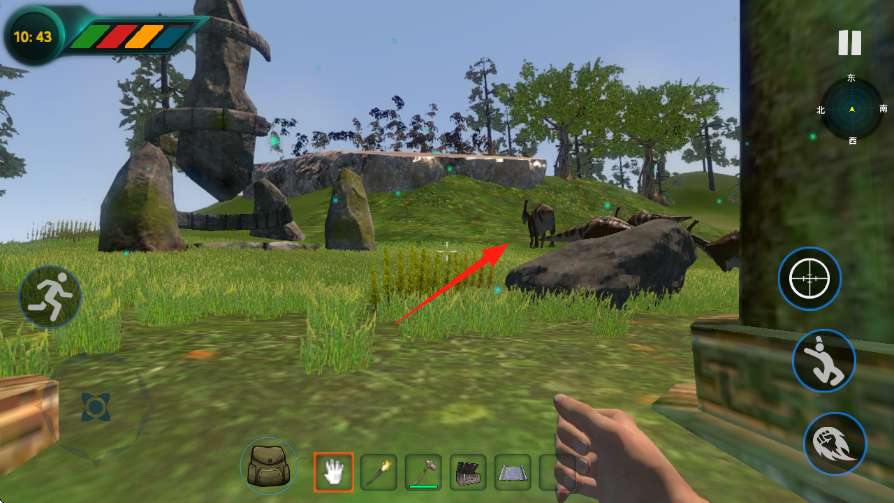 2、进入到开放的场景,经过草地、巨石阵区域,追踪食草恐龙踪迹,为狩猎做好准备。