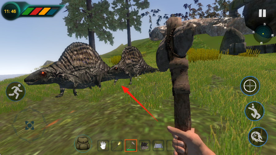 3、持石斧等工具,攻击异齿龙等恐龙,击败后采集资源,用于建造、升级,强化生存能力。