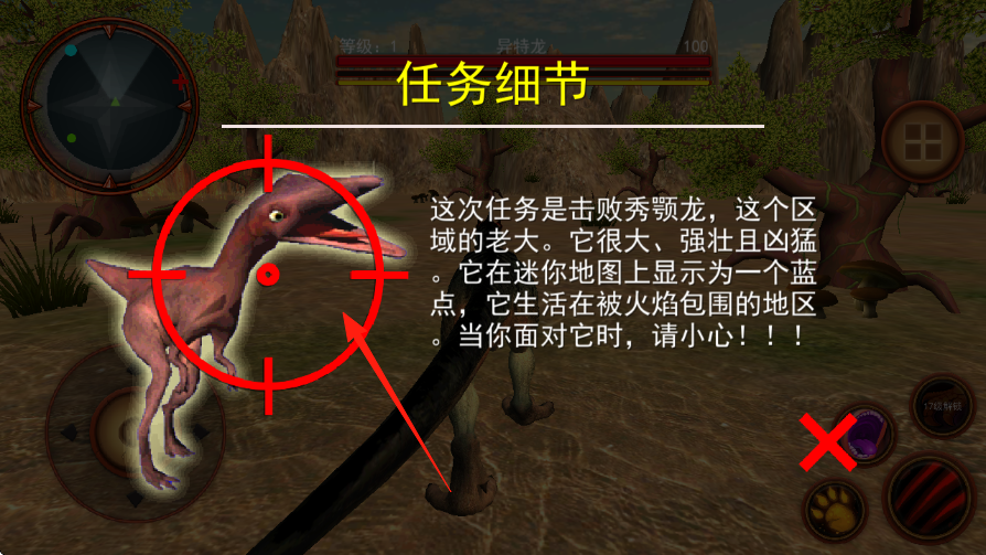 1、查看任务提示,需击败秀颚龙区域老大,火焰包围区,小地图蓝点,了解目标特征大、强、凶。