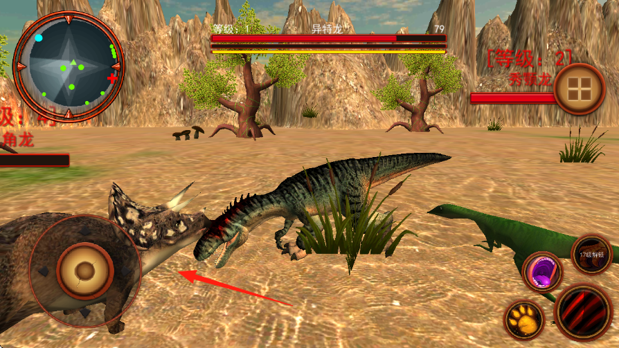 2、操控恐龙异特龙,按小地图指引,前往火焰区域,途中留意其他恐龙角龙等,可利用战斗提升等级。