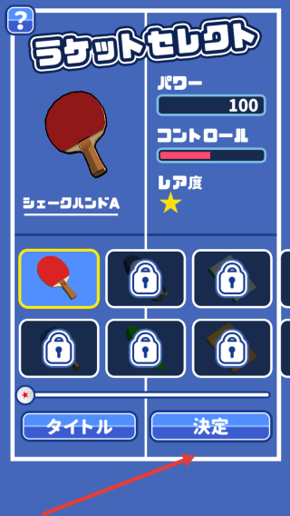 1、在球拍选择页,选定シュークリントA显示力量100等属性,点击決定确认,进入场景选择界面。