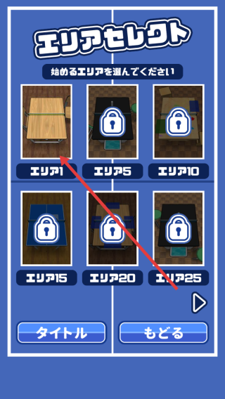 2、场景页选解锁的エリア1木质球台场景,点击对应区域后确认,进入对战,操控球拍准备击打白球。