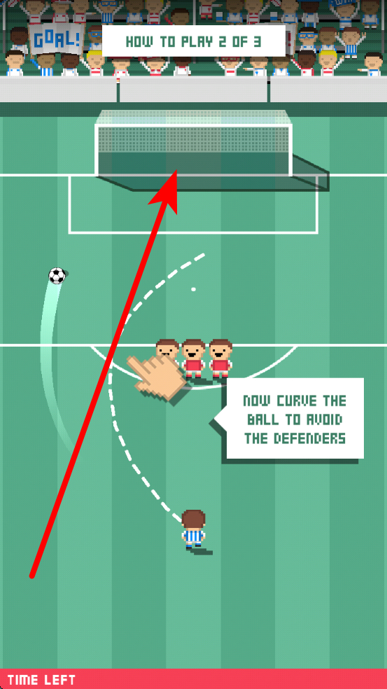 3、第二部分,面对防守球员,要学会怎么让球曲线运行,通过滑动屏幕画出曲线,使足球避开防守,精准射向中间球门,提升进球效率。