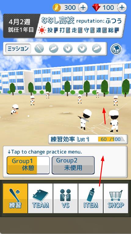 2、点击練習按钮进入练习模式,在练习场景中,可看到队员们进行棒球练习,通过屏幕上的操作提示,点击切换练习菜单,调整练习分组和练习内容。