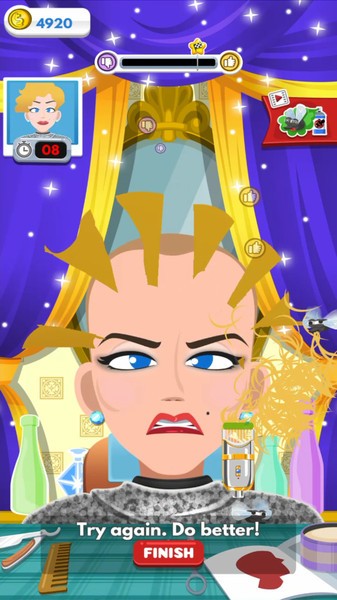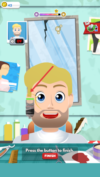 2、限时内在左上角的倒计时完成的时候完成理发,继而点击FINISH来交付,获取金币上方的数字显示。