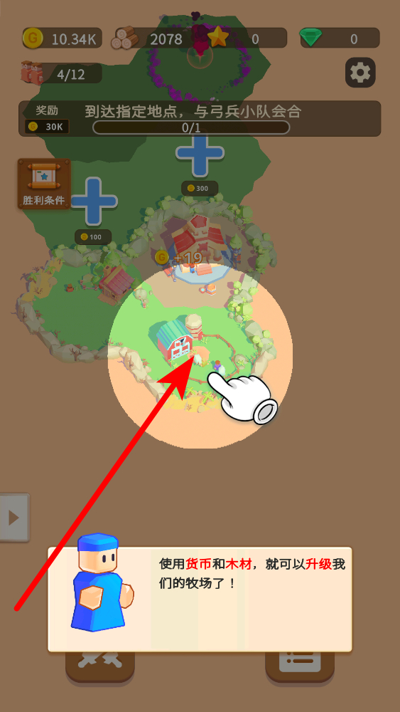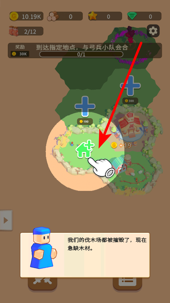 1、界面中木材资源为0,需点击绿色加号建筑按钮,进入建造界面获取木材,完成操作后能推进与弓兵小队会合的任务进度,还可获得30K金币奖励。