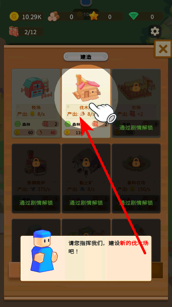 2、进入建造界选择伐木场进行建造,伐木场建成后每秒产出8木材,建造需消耗11金币,建造伐木场可解决急缺木材的困境,为后续提供资源保障。