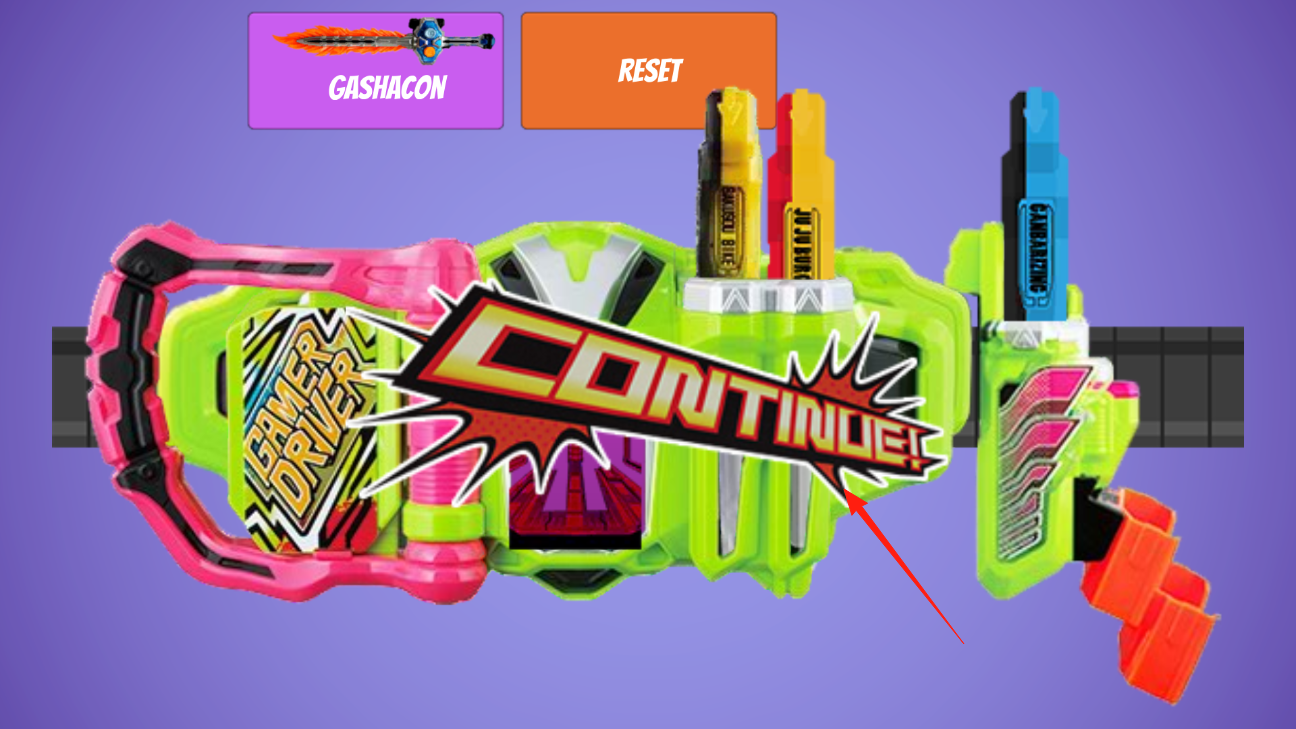 3、成功装备卡带完成变身后,出现CONTINUE提示,点这个提示,继续假面骑士的战斗或冒险环节,用变身形态去闯关打怪,延续变身带来的乐趣。